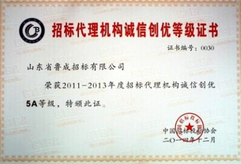 中國招標投標協(xié)會誠信創(chuàng)優(yōu)5A等級證書